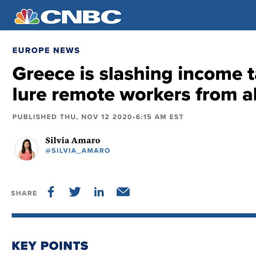 Thanks very much for this analysis, Alex -- great read. Regarding Greece as a remote work destination, perhaps the time is approaching for a more focused, dedicated approach to promoting Greece's unique character as a lure for remote workers. I'm not just talking about the sun, beaches, great food, and high English language level -- there is a vitality here that is attractive to young, curious, innovative minds. As the ecosystem evolves, and investment increases, Greece can not only reverse the Brain Drain, but also attract the next generation of hungry, young engineers and entrepreneurs from across Europe to pursue their ambitions in Greece.